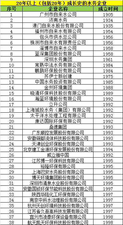據中國水網不完全統計,在中國水業發展的歷史長河中,有20年以上企齡的水務企業約有38家(如有遺漏歡迎留言補充),下面讓我們一起回顧他們昨日的風雨歷程,品味其酸甜苦辣的歲月點滴。