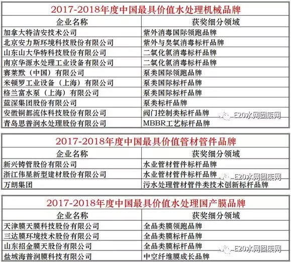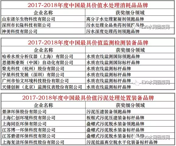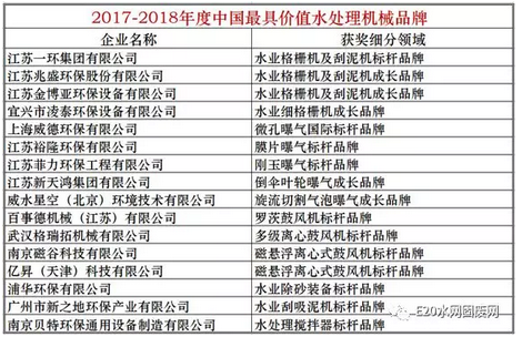 以下為“2017-2018年度中國具價值環保裝備品牌”詳細名單: