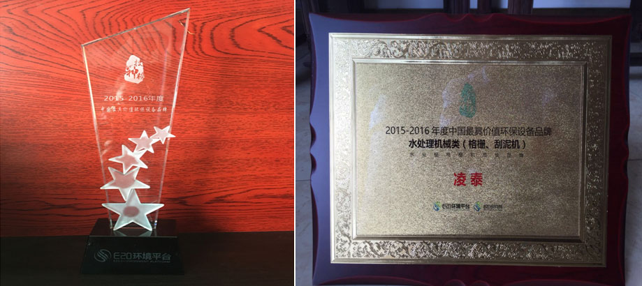 2016年6月29日由E20環境平臺舉辦的環境產業創業創新論壇上,凌泰環保格柵設備榮獲“2015-2016年中國最具價值環保設備品牌”。凌泰環保在客戶與業界的關心和支持下,2006年至今曾多次榮獲中國優秀設備廠商和全國十大用戶滿意設備品牌,凌泰環保將以“專、精、新”、品質第一、追求卓越,贏得客戶的認可和行業的好評。